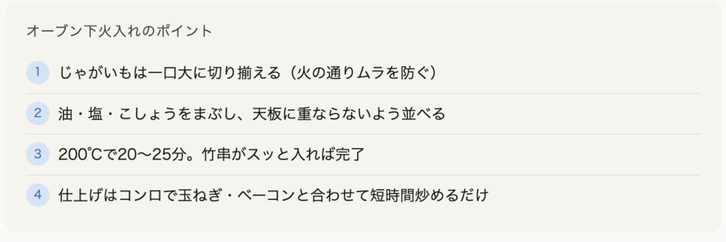 「コンロを使わずじゃがいもに火を入れる」というオーブン活用のポイントは、下処理の精度にあります。均一な仕上がりは、切り方と天板の並べ方で8割が決まります。