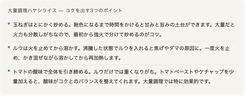 実は、ハヤシライスは少量より大量のほうが旨みが出やすい料理です。その理由と、現場でやっているコクの出し方をご紹介します。