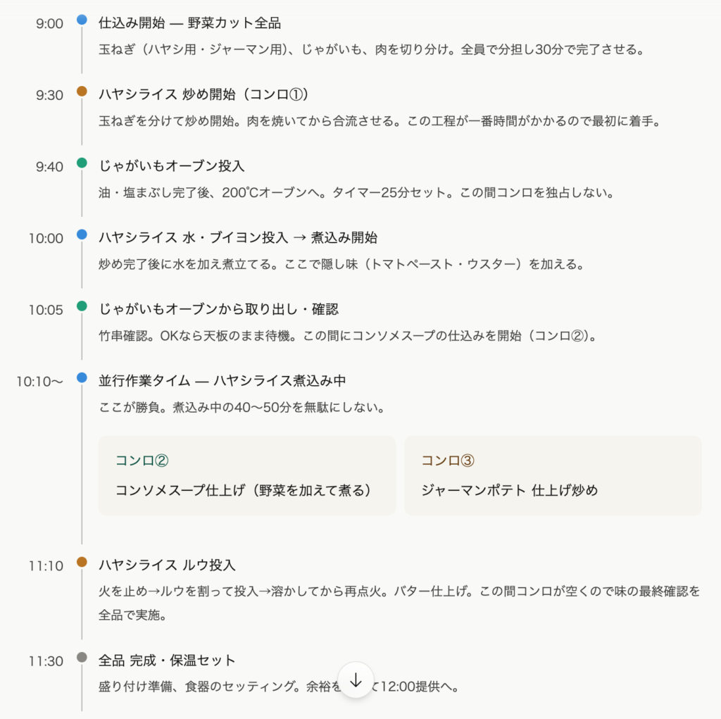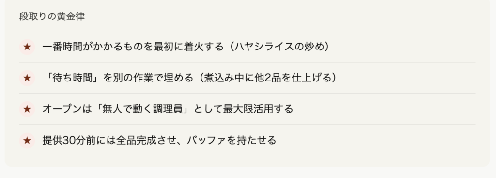 12:00提供を目標に設定した場合の動き方です。「何かを待っている時間をゼロにする」がプロの段取りの核心です。